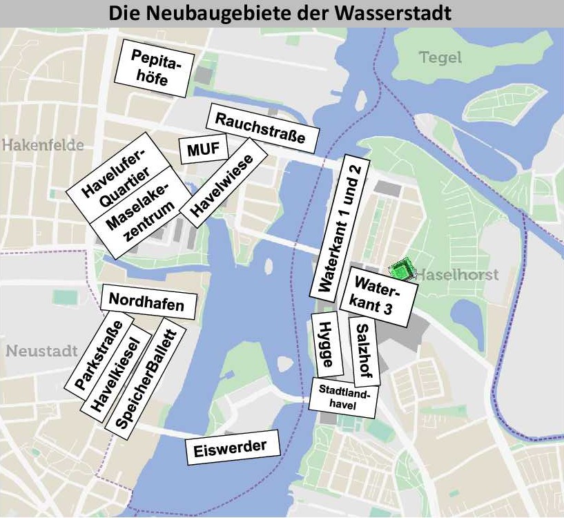 Hier sind u.a. Informationen zu Bauvorhaben in der Wasserstadt zu finden, und zwar zu: Insel Eiswerder, Parkviertel, Pepitahöfe, Buwog Speicherballett. Es fehlen allerdings Informationen zu: Rauchstraße, MUF (Modulare Unterkunft für Flüchtlinge), Havelwiese, Havelspitze, Carossa-Quartier, Maselake-Nord, Maselakezentrum, Nordhafen, Havelkiesel, Pulverturm, Salzhof, Rhenaniastraße, Waterkant, Haveleck.